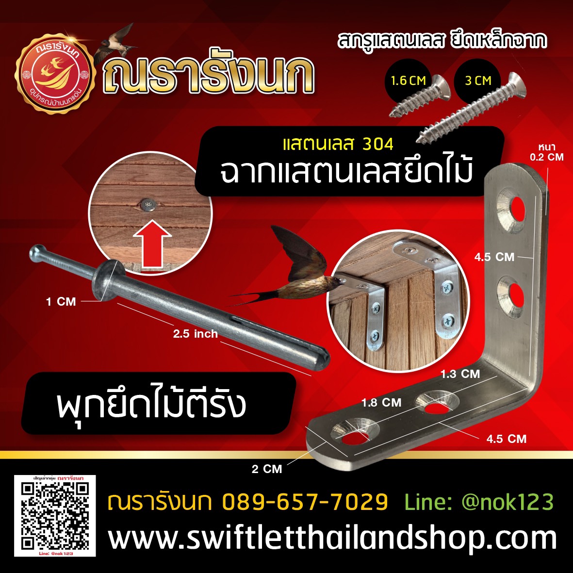 อีเมลล์: swiftletthailandshop@gmail.comเหล็กฉากสแตนเลสยึดไม้ตีรัง เหล็กฉากสแตนเลสเนื้อดี ความยาวด้านละ 5 ซม กว้าง 1.7 ซม และหนา 2 มม. เจาะรูขันนอตด้านละ 2 จุด เหมาะสำหรับการยึดไม้ตีรังในบ้านนก ทนทาน ใช้งานง่าย ช่วยให้การตีไม้รังทำได้รวดเร็ว และคงทน