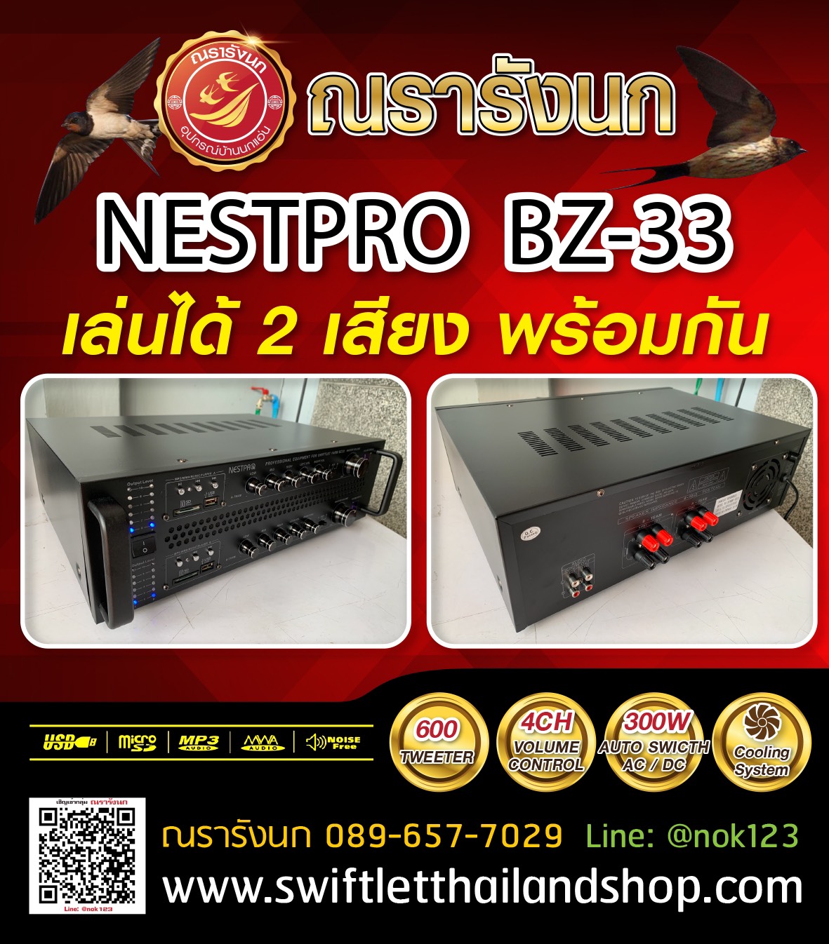 BZ33-Nestpro Amplifier BZ33-4ch-2USB เครื่องเสียงรุ่นใหญ่คุณภาพสูง จาก NESTPRO รุ่นพิเศษ มีช่องเสียบ USB/SD Card 2 ช่อง รับลำโพง600 ตัวเปิดเล่นได้พร้อมกัน 4CH แยกคุมระดับเสียงอิสระ ใช้เป็นเครื่องเสียงนอกเช่น ลำโพงบาซูก้าและลำโพงรอบทิศทางใช้เสียง A ส่วนลำโพงปากปล่องและนำใช้เสียง B เป็นต้น หรือเสียงในที่แต่ละชั้นใช้เสียงต่างกันได้ในเครื่องเดียว หรือกำหนดให้เล่นเพียงเสียงใดเสียงหนึ่งจากทุกCH ก็ได้ มีพัดลมระบายอากาศระบายความร้อนในตัว คุ้มค่าสุดๆ